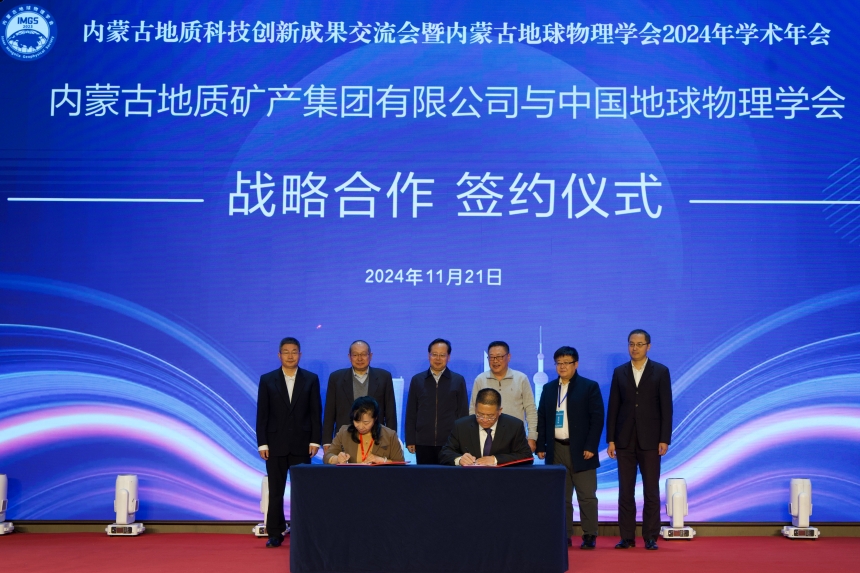 会上,内蒙古地质矿产集团有限公司与中国地球物理学会签署了战略合作协议。双方本着“资源共享、平台共筑、合作共赢、共同发展”的原则,重点围绕矿产勘查与开发、生态环境保护修复、城市地质和工程地质等产业发展,在创新创造和成果转化、开展科技成果鉴定、协助企业申报重大科研项目、智库建设和学术交流等方面开展全方位战略合作,推进科技成果转化落地,实现强强联合、互利双赢。
